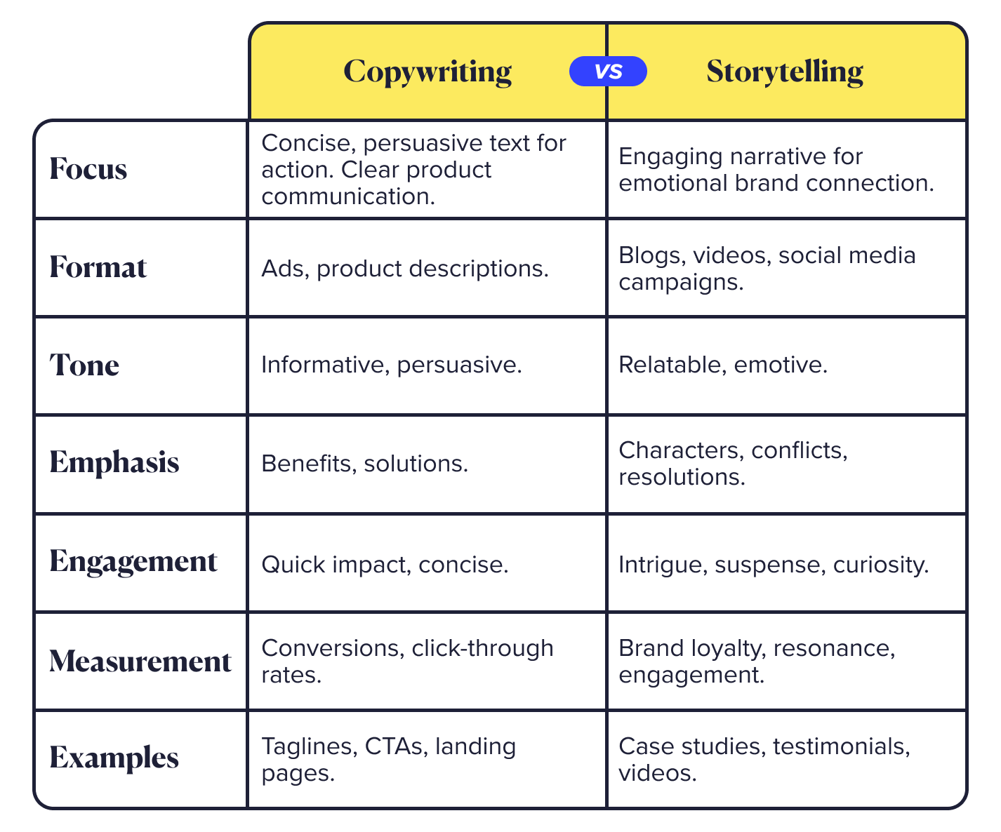 We start by understanding the distinction between “storytelling” and “copy”. Sales copy is an important type of messaging that uses persuasive tactics to drive action (namely, purchases). It’s concise and direct, highlights the benefits of a product or service, and asks the viewer to take the next step. While copy certainly has its place in marketing, it’s missing some key characteristics of effective storytelling.