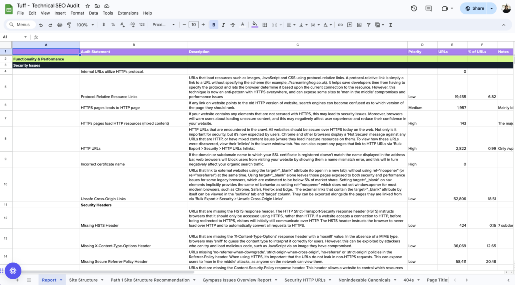 We’re sharing the very spreadsheet we used to run the technical SEO audit – a comprehensive spreadsheet that allowed us to build a map of all website URLs, identify issues, and develop mitigation strategies.