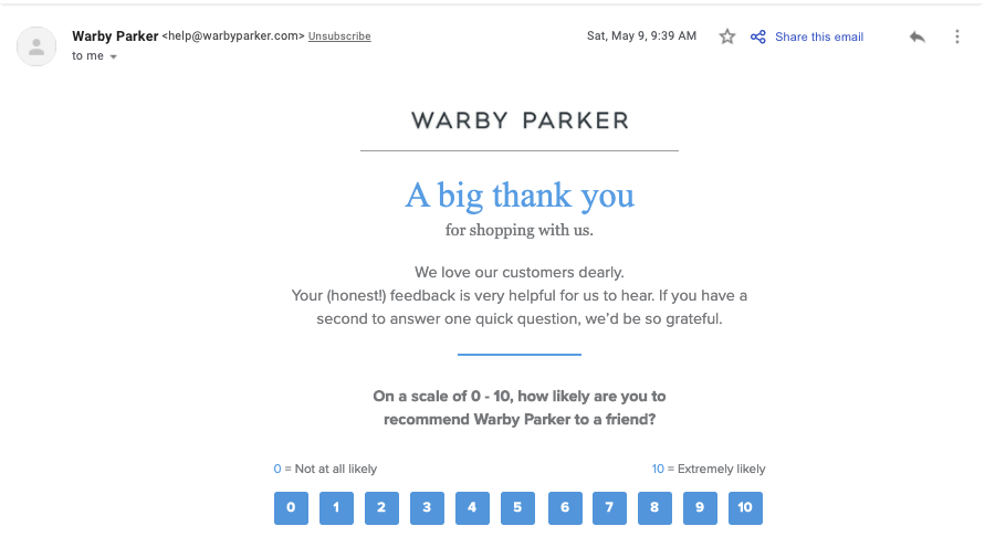 Lastly, Warby Parker, which could probably offer a PhD in emailmarketing, sent me a feedback email a couple of weeks after I bought a pair of glasses. I like this one because it’s short to the point and honest. And the subject line “Three cheers for feedback” is human and inviting.
