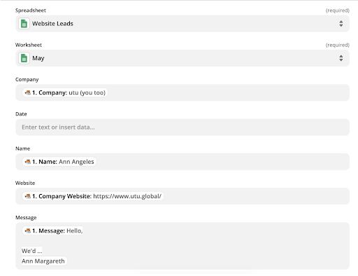 Step 12: Now that you’re connected to the correct spreadsheet then Zapier will pull in header information and you will need to select what information from the form goes in each header column.