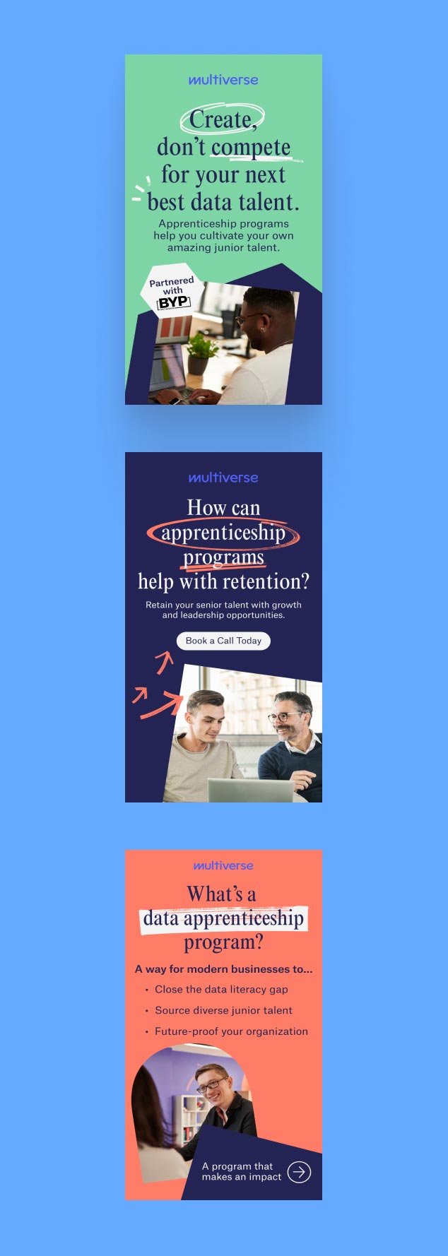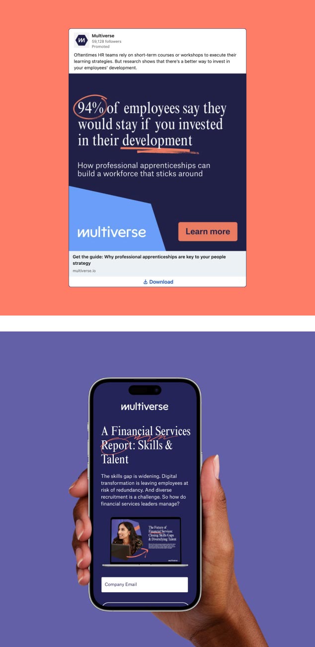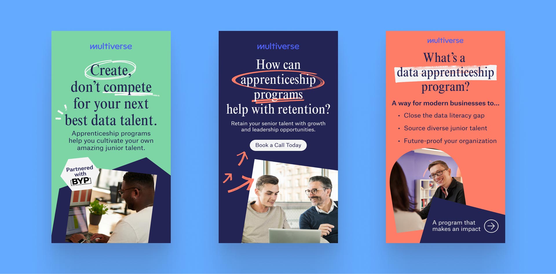 We used 6Sense as our ABM platform and worked with the Multiverse team to identify a list of target accounts in the US. Because of 6Sense’s capabilities and Multiverse’s TAM, LinkedIn presented the clearest path to success. It offers robust B2B targeting to narrow in on specific positions, departments, and seniority levels working at our target accounts. LinkedIn also offers highly-visual placements, giving us the timeline real estate to creatively convey Multiverse’s most compelling value props.