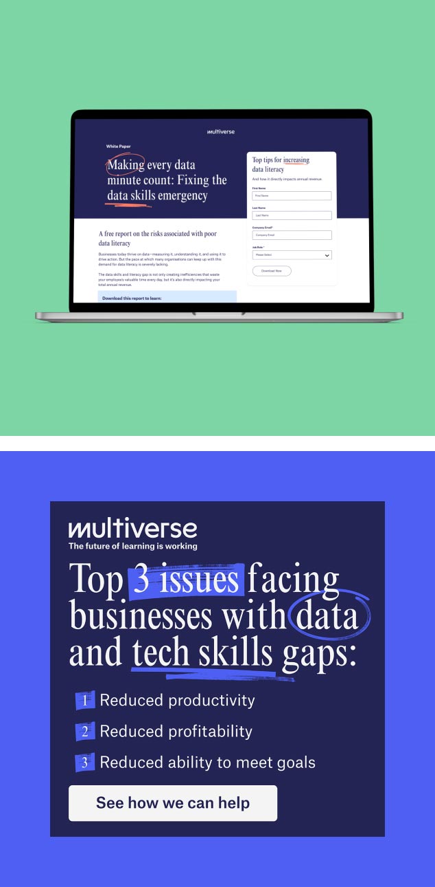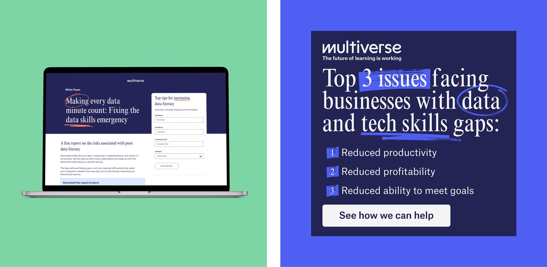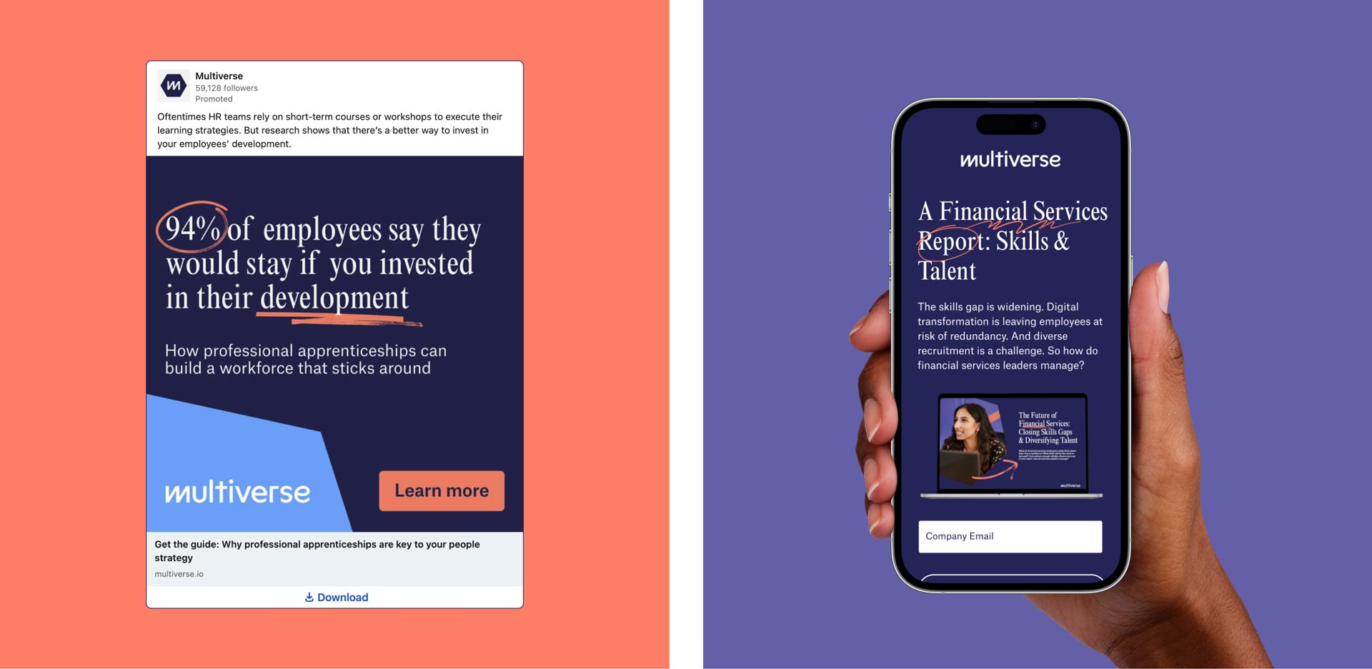 We used 6Sense as our ABM platform and worked with the Multiverse team to identify a list of target accounts in the US. Because of 6Sense’s capabilities and Multiverse’s TAM, LinkedIn presented the clearest path to success. It offers robust B2B targeting to narrow in on specific positions, departments, and seniority levels working at our target accounts. LinkedIn also offers highly-visual placements, giving us the timeline real estate to creatively convey Multiverse’s most compelling value props.