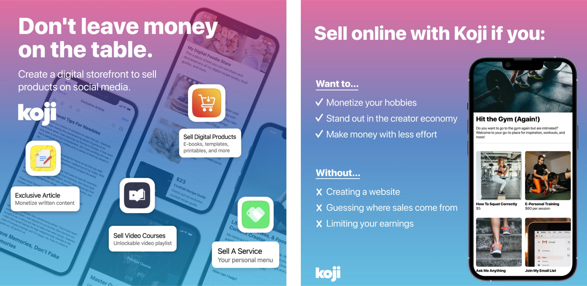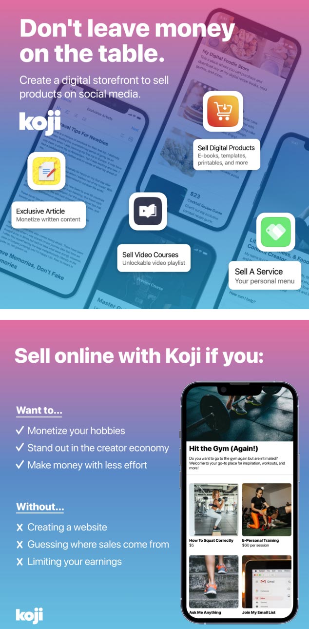 Koji is a free digital storefront for creators who want to monetize their social media channels. The platform offers a range of templates that make it easy for users to sell products, collect donations, engage with customers, and earn affiliate commissions directly from their social media accounts without a website.