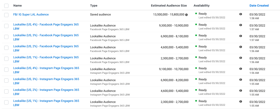 Lookalike audiences are a powerful way to reach new people in your potential conversion pool. Work smarter, not harder. By using data you already have access to (think: past purchasers, people who have visited your website, people who have engaged with your accounts, etc), you can strategically build lookalikes of this data. Once you pick the source for your lookalike audience, you’re able to go a step further and select the percentage (of lookalike) you want to use, ranging from 1% to 10%. We have seen some of the strongest performance for our eCommerce partners with combining a mix of percentages – Example: Targeting a 1%, 2%, 3%, 4% and 5% lookalike audiences. By combining different levels of intent, you’re able to more broadly target potential customers and maximize your brand’s exposure in one fell swoop.