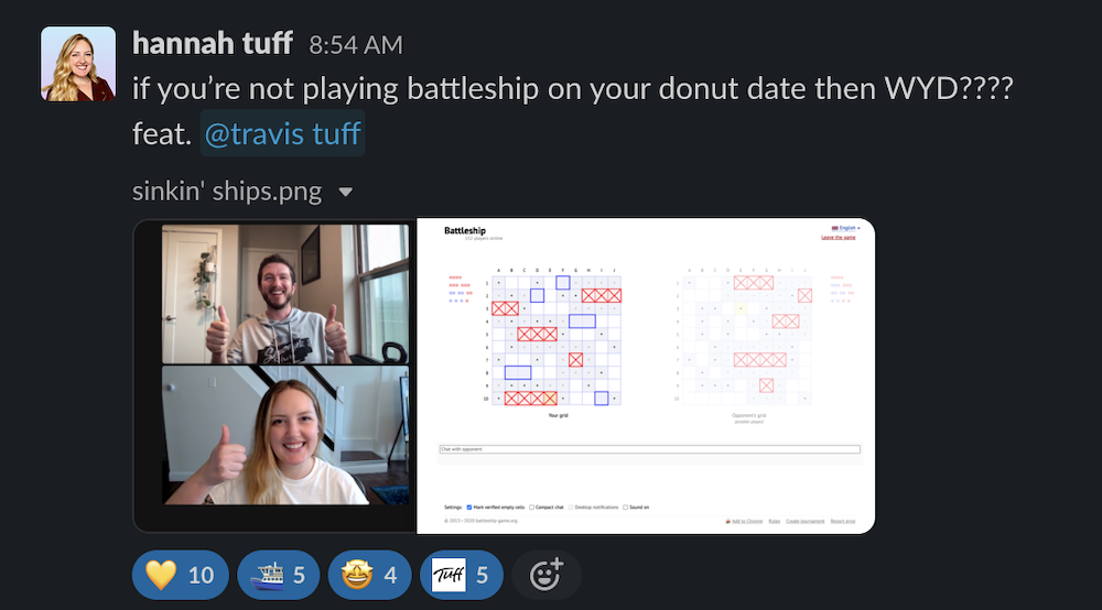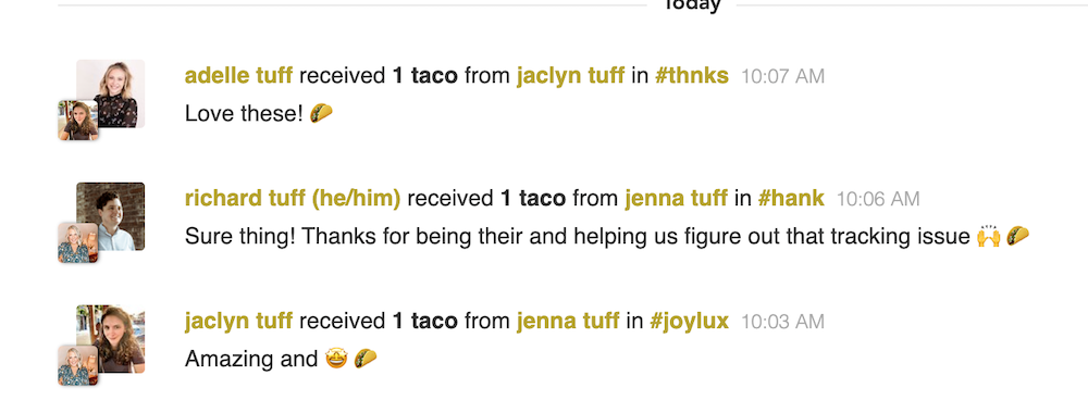 As a remote-from-day-one growth marketing agency, it took us a long time to figure out a baseline mix of things that help us connect in ways that feel “Tuff.” I’d highly recommend that your takeaway from this is less “let me go install HeyTaco” and more “who on our team might have a good idea to contribute to a conversation about ways to connect?”