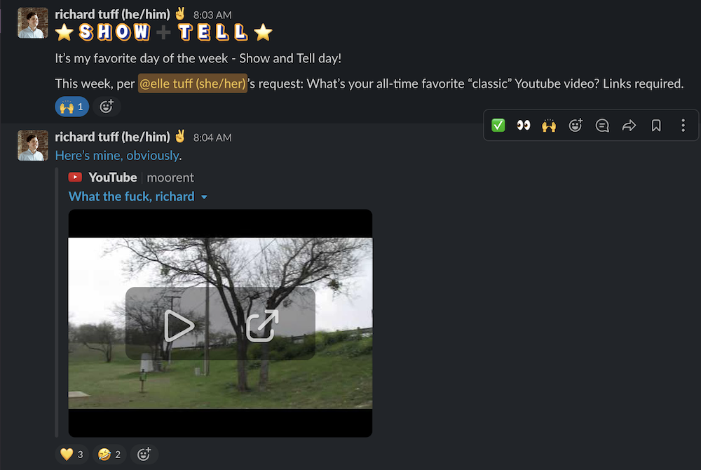 Back to Slack! Show & Tell is a highly anticipated, always fun, always casual weekly occurrence in Slack pioneered by Richard. Each week, Richard will drop a fun prompt into the #general channel and it always has the ability to fire up conversations. Here are some of our recent favorites!