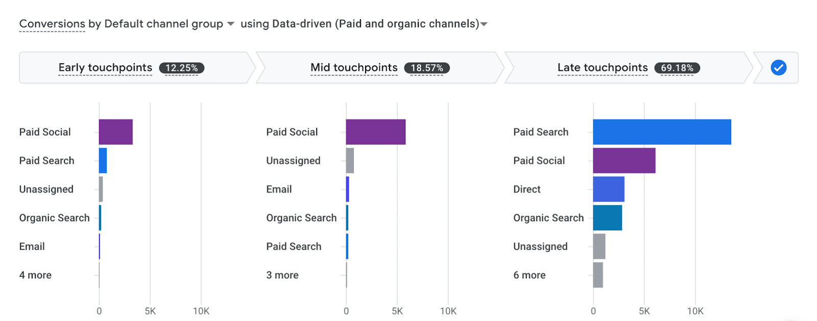 Examining conversions by source like the visualization above shows the impact of paid and organic channels across various stages of the customer journey. In the early touchpoints, paid channels amplify brand recognition and ignite initial interactions. Activating retargeting initiatives across social caused that spike in mid-journey touchpoints on Facebook. The huge jump in conversions during late touchpoints shows that further down the funnel, people are more likely to convert on Google, Facebook, AND direct. Altogether, we see that different platforms have power at various stages of the user journey, and using this data helps marketers decide how to spend resources wisely for growth.