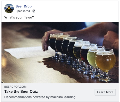 Our click objective campaigns, example below, we developed around a “quiz” concept where we wanted to drive as much traffic as possible to the quiz, collect an email, and then retarget. The engagement and click stats were bonkers. To no one’s surprise, people love beer quizzes almost as much as they love beer. Although we had incredible results here, we ultimately killed it because it wasn’t helping with our end to get more subscribers at an efficient cost.