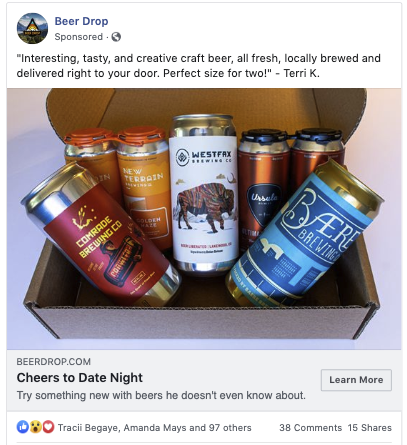 Our subscription objective campaigns, example of one of the ads below, were setup using custom conversion event tracking. We place code on the subscription confirmation page and tell Facebook to help us get our ads in front of people likely to subscribe. This doesn’t always work for newer brands or startups like Beer Drop but for us, because of our data-driven target and user-specific copy, it worked.