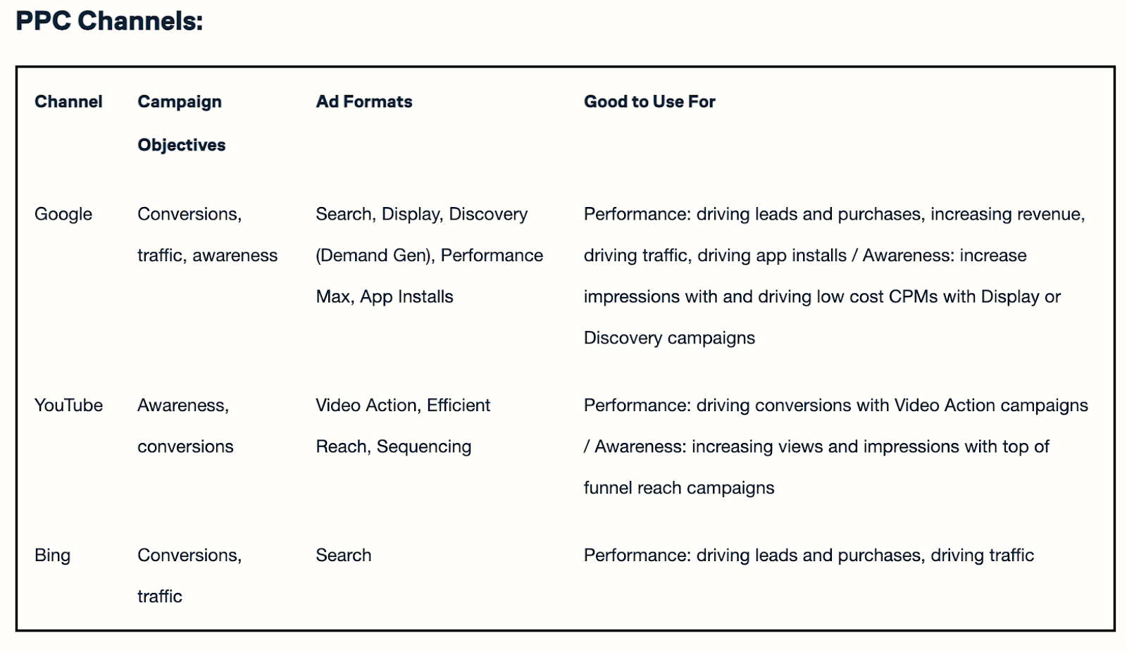 With your goals in hand, it’s time to start crafting your paid media plan. Your choices here fall into two larger buckets: PPC channels and social ads channels. You can reference the tables below for an idea of which channels are going to best help you reach your campaign goals.