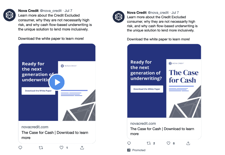 The answer is not all that simple, because of course I’m going to tell you the magic word that infiltrates most of our creative work here at Tuff – TEST! If you have the capabilities and resources to develop several types of formats, then we recommend testing to see what resonates with your target audience the best. For one of our partners, Nova Credit, where we tested a static image promoting a white paper download versus an animated version of that same graphic, the ads generated the following results: