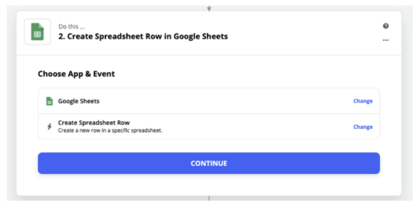 Choose Google Sheets as your app and Create Spreadsheet Row as your event in Step 2 of your Zap.